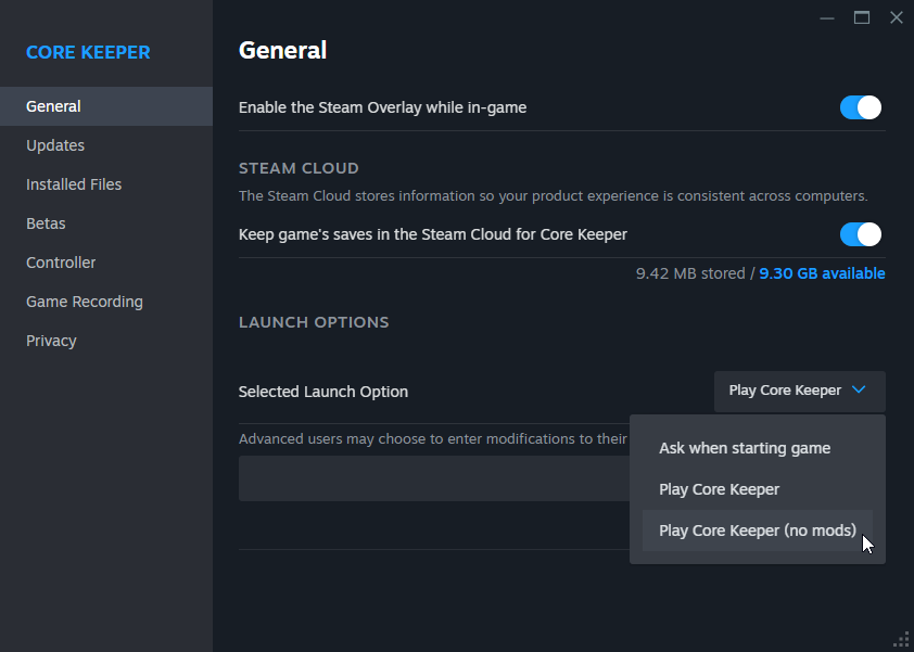 <figure><img src="https://2243841139-files.gitbook.io/~/files/v0/b/gitbook-x-prod.appspot.com/o/spaces%2FfgyOx4rs392HNuE1NILG%2Fuploads%2FaZ4lhOMeoF9iWEuRWEvL%2Fimage.png?alt=media&#x26;token=a3bc1a10-b7b0-447f-af81-9b83b1326244" alt=""><figcaption><p>Switching to the No Mods launch option.</p></figcaption></figure>